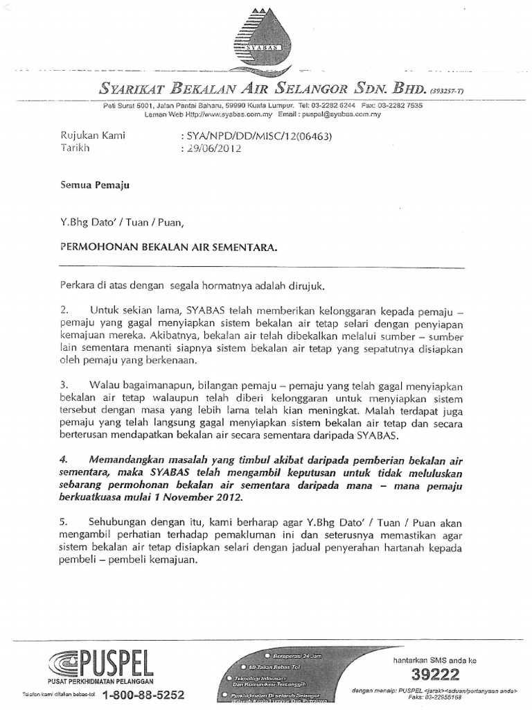 Perbadanan Putrajaya Syarikat Bekalan Air 2 2 Iii Surat Sokongan Km Daripada Syabas Iv Analisa Pdf Document from demo.vdocuments.site Salinan kad pintar pemohon (pemilik projek yang dipohonkan). Air selangor sdn bhd (air selangor), tidak dapat menjangkakan bila bekalan air di kawasan yang terjejas akan pulih. Dapatkan di kaunter perkhidmatan di kesemua 10 pejabat wilayah pengurusan air selangor sdn bhd. Perkhidmatan ini dikendalikan oleh jabatan perkhidmatan air, jkr dibawah kementerian pembangunan. Gangguan bekalan air selangor 2021: Borang permohonan skim air darul ehsan. Permohonan yang telah lengkap di isi perlulah di terima sebelum tarikh tutup di bawah. Berita terkini yang kami terima sekarang ini syarikat air selangor ini telah menjadi syarikat yang akan membekalkan bekalan kepada anda semua yang tinggal di kuala lumpur kl, putrajaya dan juga negeri selangor.