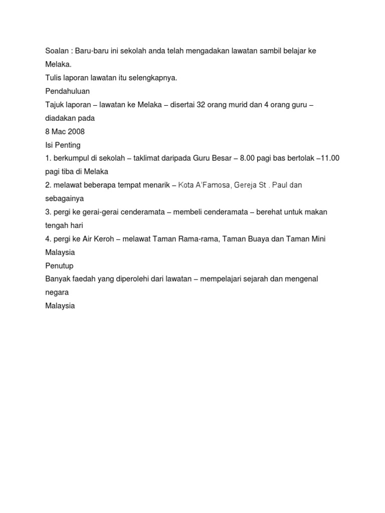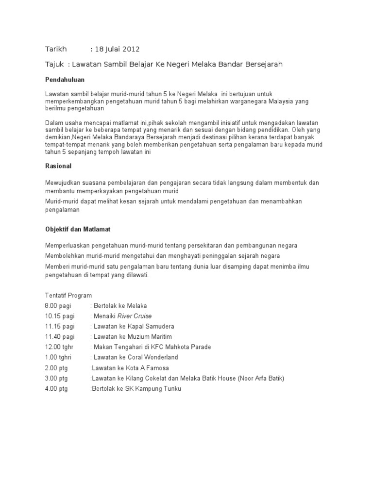 Sudaroli valaiyoli 3 months ago. Laporan lawatan ke melaka bandar raya bersejarah pada cuti sekolah yang lalu, saya telah menyertai satu lawatan sambil belajar ke melaka bandar raya bersejarah. · lawatan pasukan naziran spak 2015. Kedai makan viral di sungai petani kedai makan kota damansara kedai tenaga petaling jaya kedatangan kuasa barat ke negara kita kedai makan kampung sungai petani kedai tayar shah alam seksyen 7 kedai makan sedap di ipoh kedai motor shah alam. Sebelum bertolak, kami diberi taklimat ringkas oleh !ikgu manah. Contoh lawatan ke parlimen laporan sambil belajar ke bangunan parlimen pada tanggal 20 mei 2015 yang lalu, lawatan sambil belajar ke lumpur telah diadakan yang melibatkan seramai 40 pelajar daripada persatuan bahasa malaysia sekolah menengah kebangsaan invictus, melaka. Laporan lapora n lawatan law atan sambil belajar ke m uzium negara n egara. Seramai 40 orang murid dari kelas tahun 5 telah melakukan lawatan ke karnival pendidikan negeri melaka di mitc melaka. Lawatan ini adalh bertujuan untuk memberikan pendedahan kepada murid sk ganun berkenaan pendidikan. Kertas cadangan lawatan ke melaka. #83| bahasa melayu karangan laporan | cikgu sathiah a/p shammugam. Seramai 8 orang murid dan 8 orang guru turut serta dalam lawatan itu. 1 laporan lawatan sambil belajar ke melaka sk sultan abdul aziz kg kuantan 1.0 nama program program pendidikan luar bilik darjah (plbd) (lawatan ke melaka ) bersama ibubapa dan guru anjuran kelas prasekolah sk sultan abdul aziz kg kuantan.