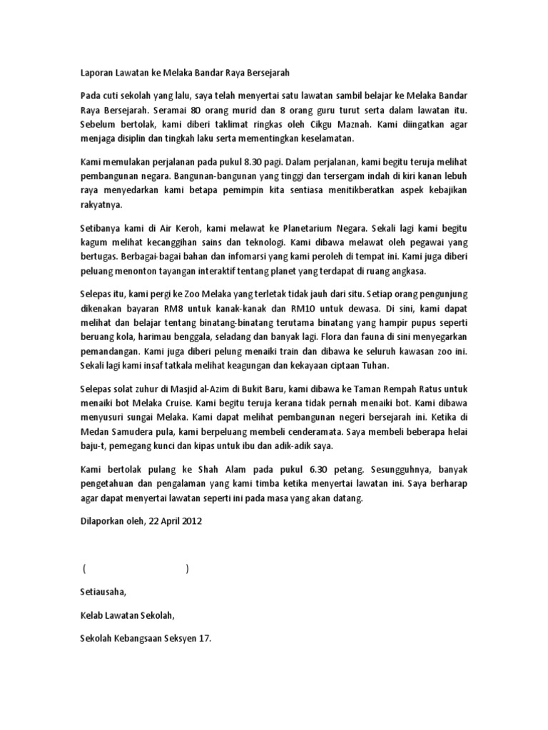 Contoh lpj kegiatan karangan laporan lawatan ke melaka bandar raya bersejarah surat kiriman tidak rasmi rumah warga emas kertas kerja program. Laporan lapora n lawatan law atan sambil belajar ke m uzium negara n egara. @inproceedings{shaari1994laporanlk, title={laporan lawatan ke tapak pembinaan bangunan}, author={a. Setiap orang pengunjung dikenakan bayaran rm8 untuk kanak&kanak dan rm+ untuk dewasa. 1 laporan lawatan sambil belajar ke melaka sk sultan abdul aziz kg kuantan 1.0 nama program program pendidikan luar bilik darjah (plbd) (lawatan ke melaka ) bersama ibubapa dan guru anjuran kelas prasekolah sk sultan abdul aziz kg kuantan. Laporan lawatan ke melaka bandar raya bersejarah. Sudaroli valaiyoli 3 months ago. Pada 24 ogos 2009, sekolah kebangsaan seri tualang telah mengadakan lawatan ke melaka, bandaraya bersejarah. Pada tanggal 20 mei 2015 yang lalu, lawatan sambil belajar ke bangunan parlimen di kuala lumpur telah diadakan yang melibatkan seramai 40 pelajar daripada persatuan bahasa malaysia sekolah menengah kebangsaan invictus, melaka. Seramai 8 orang murid dan 8 orang guru turut serta dalam lawatan itu. Selepas itu, kami pergi ke *oo melaka yang terletak tidak jauh dari situ. Laporan lawatan sambil belajar ke kompleks sejarah pasir salak. Tuliskan satu laporan tentang lawatan tersebut.